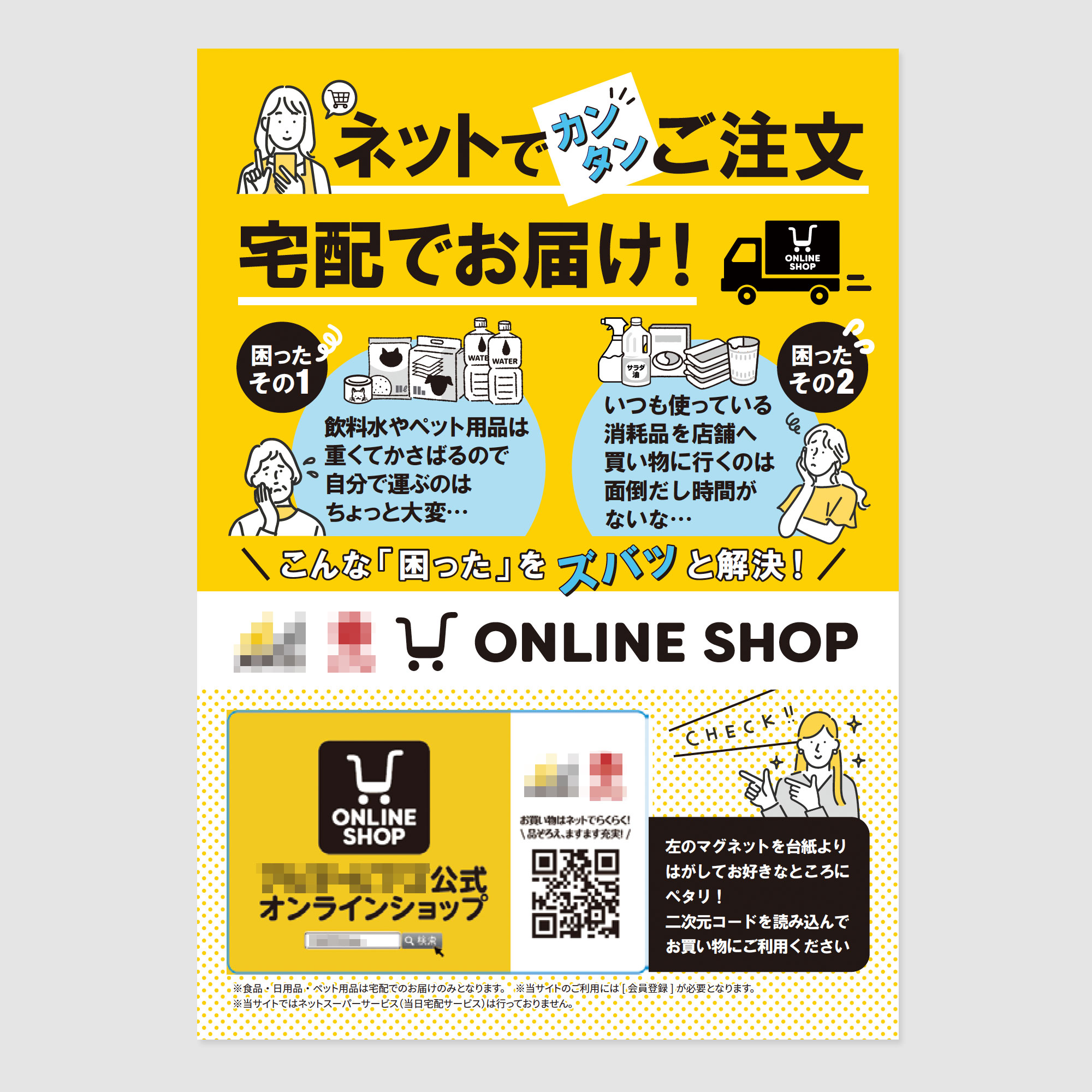 あまり周知されていない通販サイトを認知していただくための施策として、2次元コードを表示したマグネットプレートとマグネットプレートを配布するための台紙デザインです。店頭で販売している運搬困難な商品を通販でも簡単にご注文いただける、というメリットを伝えるための施策です。