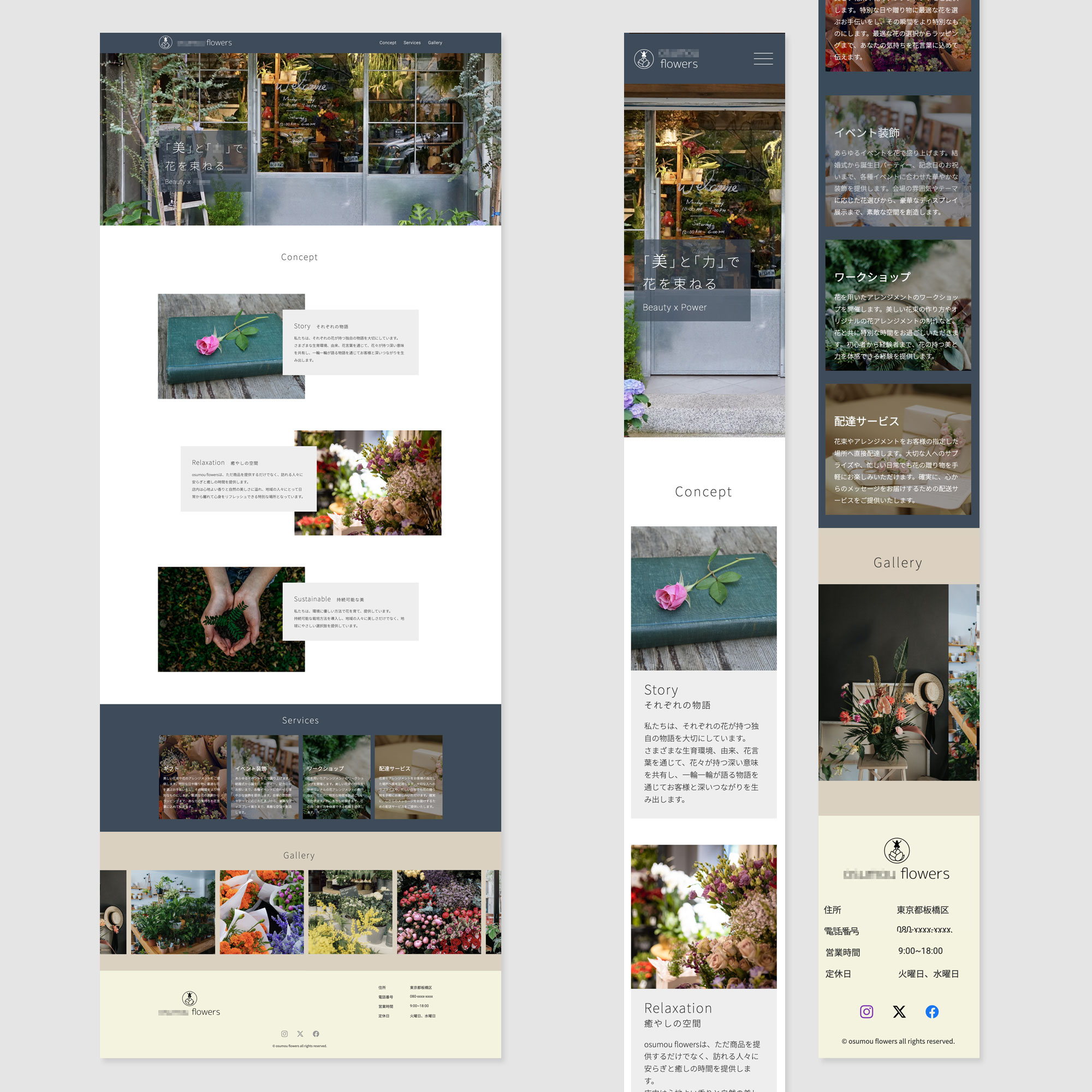 フラワーショップサイト デザインについて フラワーブティックショップのサイトデザインです。アート系フラワーショップということで、落ち着いた色合いでおしゃれな印象にまとめました。各セクションの画像がスクロールする時にふわっと表示されるアニメーションを効果的に使用しています。ギャラリーセクションでは、右から左へ画像を自動的にエンドレスにスクロールさせ、極力多くのイメージを表示させる工夫を施しました。 担当 デザイン・コーディング Works一覧へ